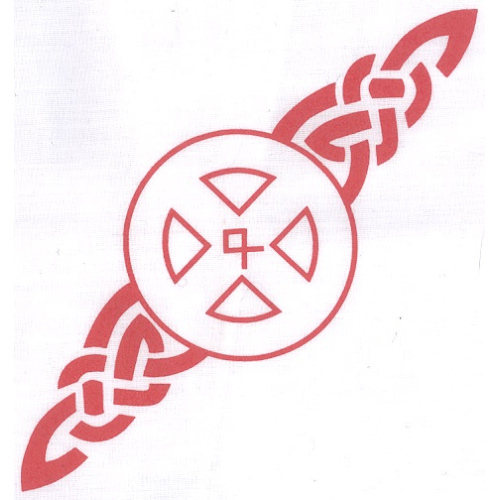 Quality, white cotton-blend cloth with sunwheel, Othal rune, and traditional knotwork silk screened in blazing red. This cloth is the size of a standard bandana, and is suitable for use as a small altar/stalli cloth, or may be folded and worn as a headband.