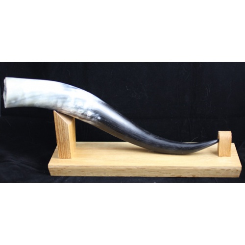 Crafted of solid oak and meant to hold a medium to large deluxe mead horn. Measures 12" x 4" at the base, and 5" tall. Natural oak color and fine finish. Heathen Made. (horn shown not included)